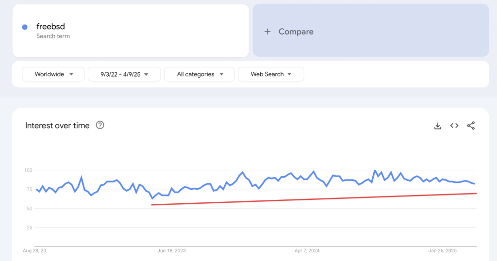 我有一个假设,能解释为什么人们 认为 FreeBSD 正在衰亡,以及引言中提到的那个令人吃惊的结论。