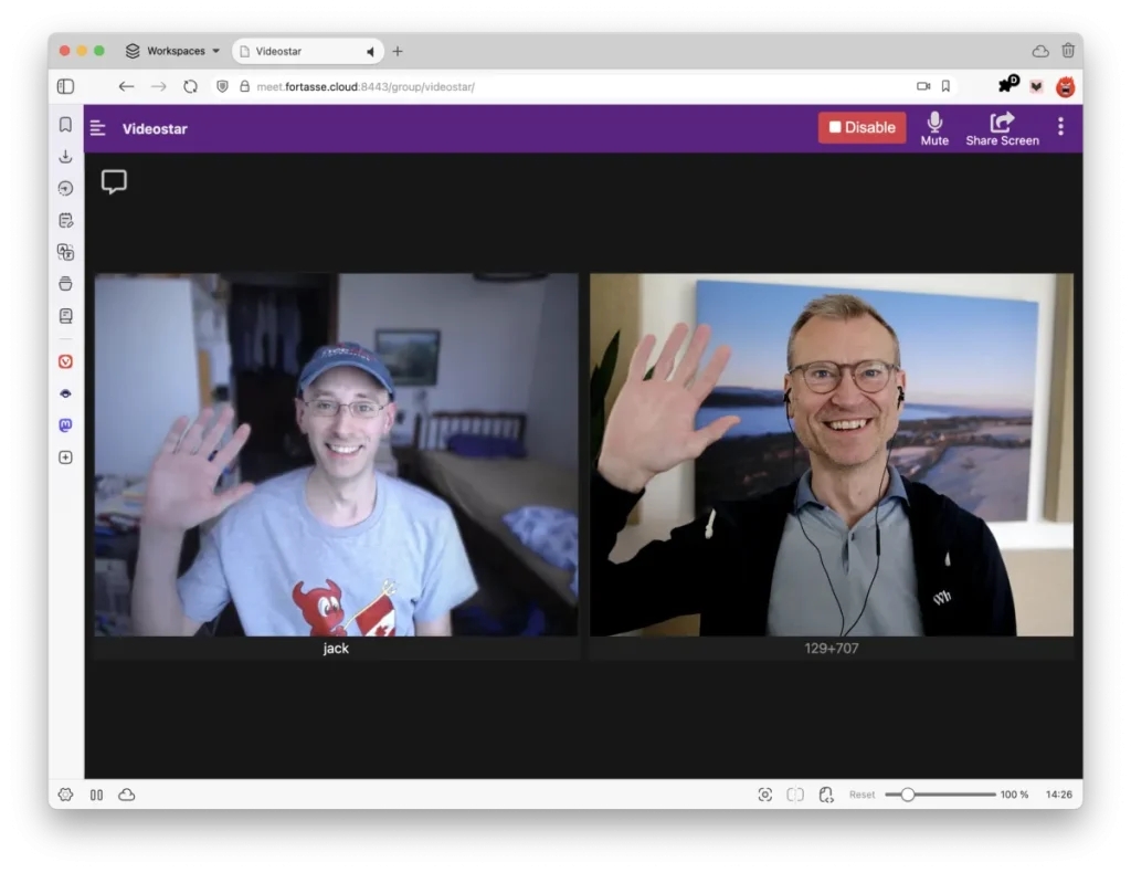 在同一行里,可以看到 Galene 默认监听的端口 8443。假设我们的主机名是 videostar.example,在浏览器地址栏中输入: