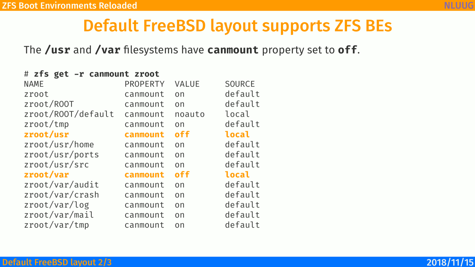 这是我以前关于 “ZFS 启动环境” 的演讲中的幻灯片 —— 可以在链接 https://is.gd/BECTL 获得 —— 那是在 2018 NLUUG 会议上做的……颜色并不是随便选的……它们是特地准备成那样,以致敬 NLUUG 会议举办的国家 —— 荷兰。